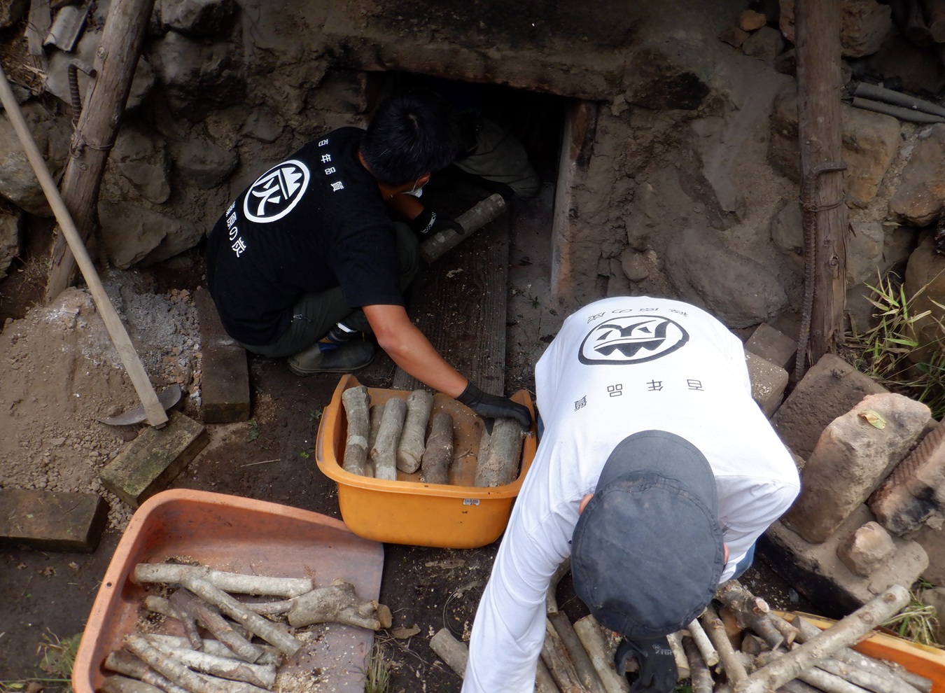 まずは、炭釜に入っている木炭を運び出し、仕分け作業をするところから始めます。広葉樹にもナラ、クヌギ、サクラなど様々な種類があり、樹種の特徴から見分けられるようになります。窯を空にした後で、伐採した木材を均等に並べ窯の中を埋めていきます。